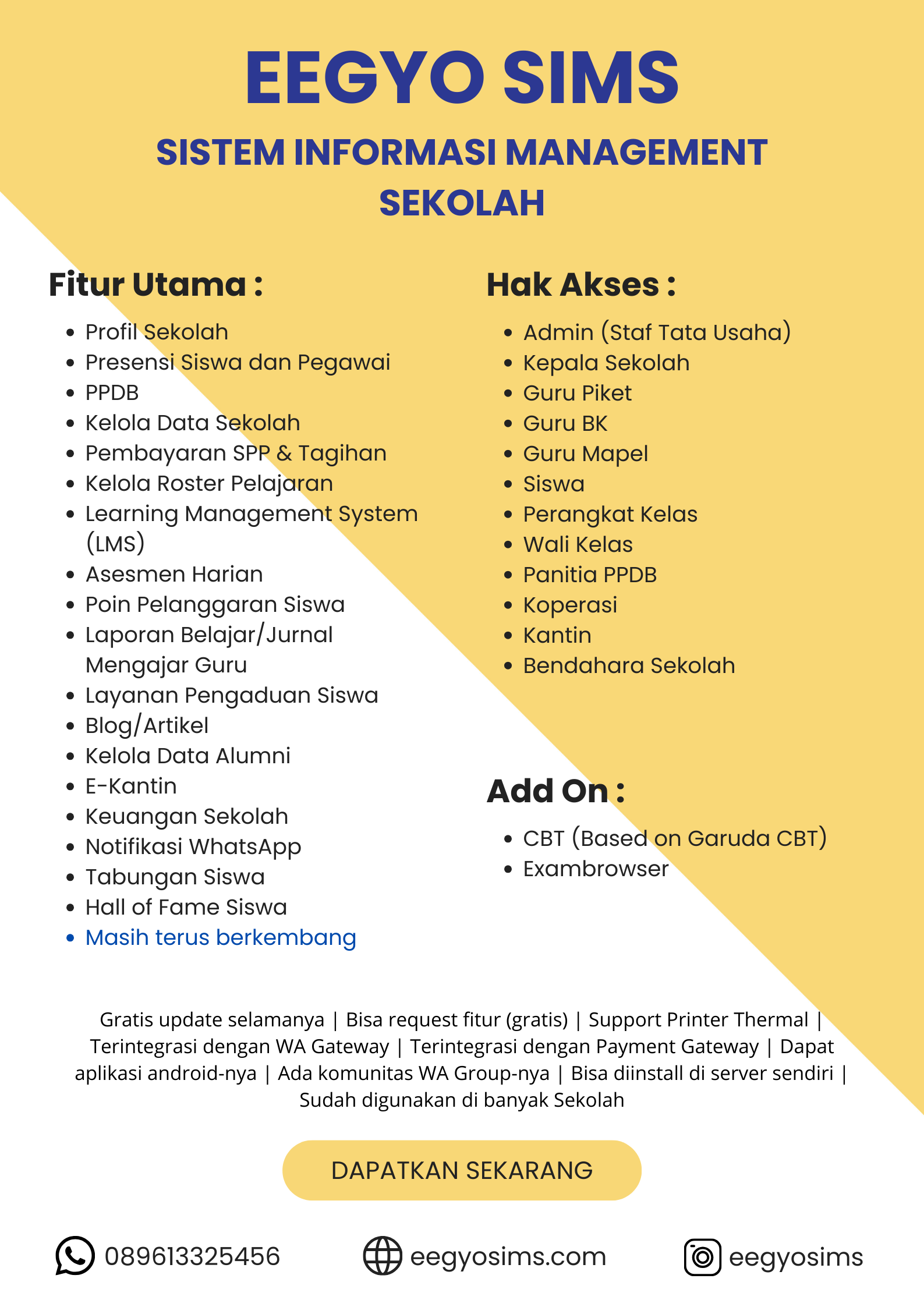 Eegyo SIMS adalah Aplikasi Sekolah yang dirancang untuk menyederhanakan tata kelola data dan proses birokrasi sekolah menjadi pengalaman yang efisien, efektif, dan terpadu secara digital. Sudah dipercaya oleh 28+ Sekolah di Indonesia!